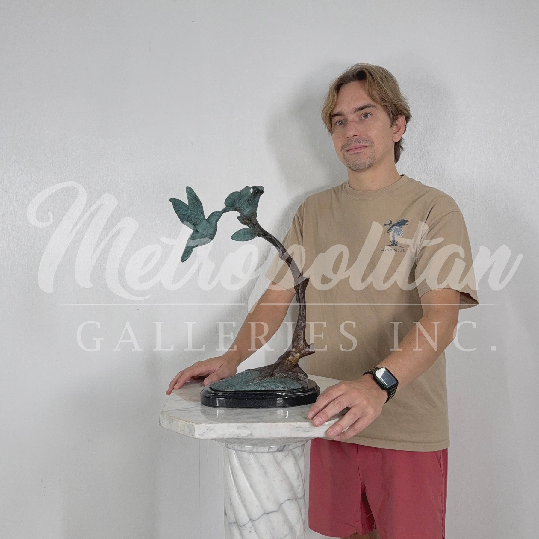 Hummingbird on Flower Bronze Table-top Statue by Metropolitan Galleries was sculpted in clay and cast in bronze. Ideal for placement indoors and outdoors.