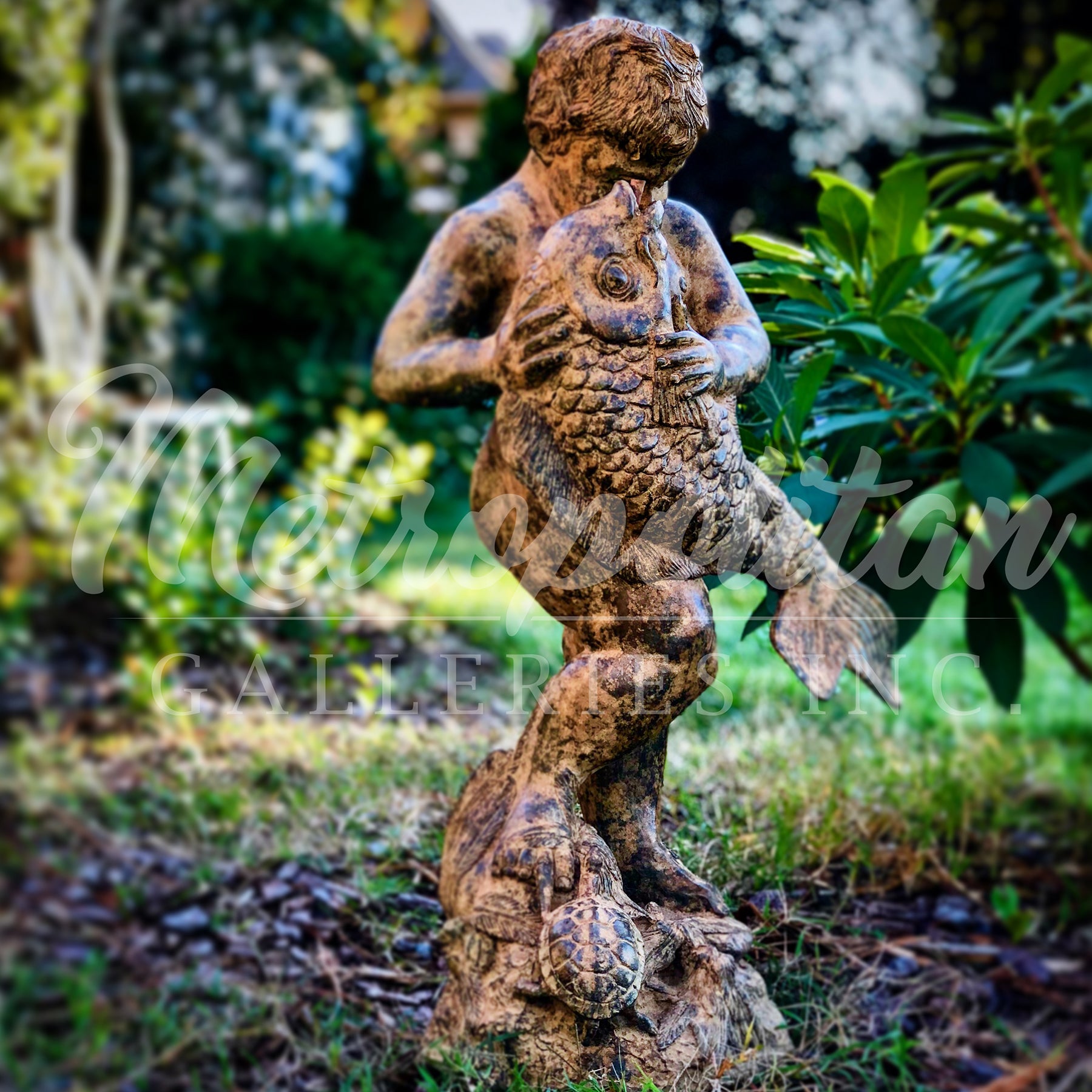 Putto holding Fish Bronze Fountain Statue by Metropolitan Galleries was sculpted in clay and cast in bronze. Ideal for placement indoors and outdoors.