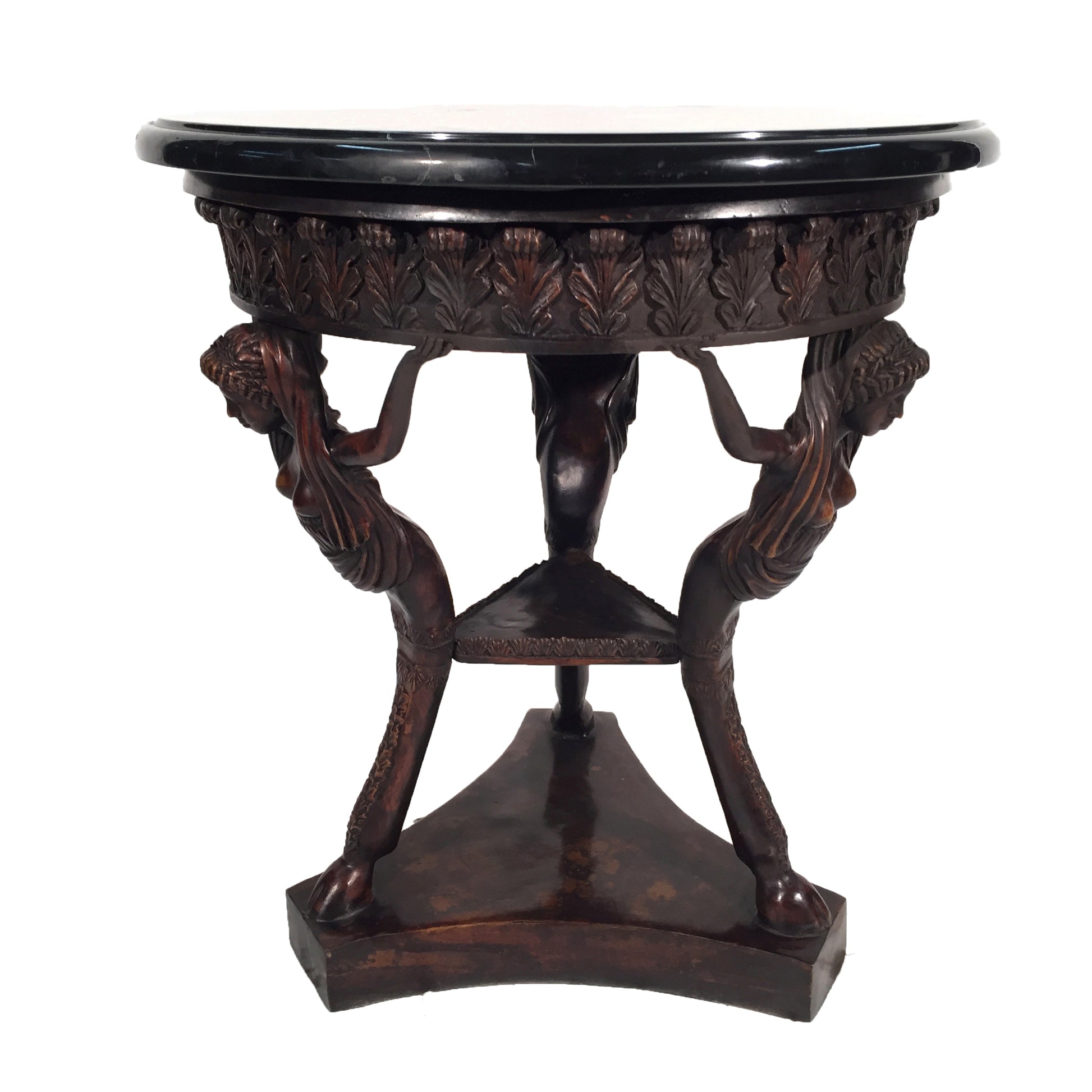 Three Satyr Bronze Table Base with Marble Top by Metropolitan Galleries was crafted by skilled stonemason. Featuring vibrant veining and polished finish. Ideal for placement indoors only.